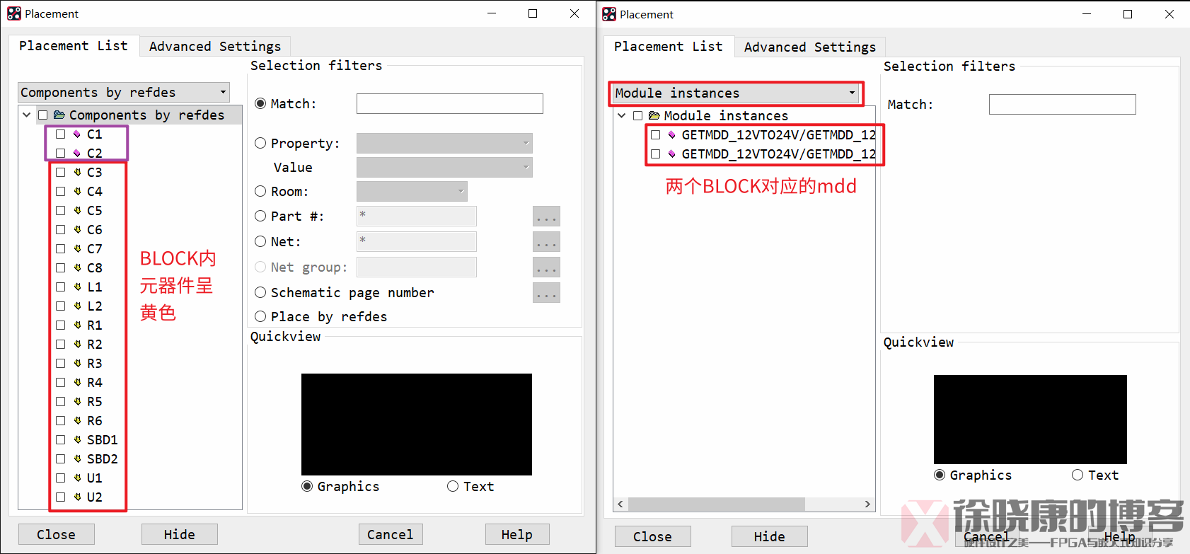 导入网表后,Place -> Manually…,打开Placement窗口,如下图所示。可以看到 Components by refdes中,BLOCK内的元器件呈黄色,BLOCK外的呈粉红色。再看Module instances,可以看到两个BLOCK对应的mdd。