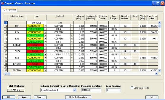 在系统中,整个电路板的厚度是一个固定值,所以不要改变它。在这里可以设置每一层的厚度,层面的类型,绝缘层的介电常数,线宽等等,并能计算出相应的特性阻抗值。Mode 当“Differential Mode”被选择时,线宽、阻抗、差分阻抗、差分间距、差分耦合的模式都是相关联的。根据改变的值,编辑器都会弹出菜单,允许进一步进行准确设置。Material 从下拉菜单中选择材料。Loss Tangent 根据绝缘层的功率因数补偿角的正切,指定当前选择的绝缘层的介电损失。Type 层面的类型,包含SURFACE、CONDUCTOR、DIELECTRIC、PLANE 等。Thickness 分配给每个层的厚度。Line Width 确定布线层的布线宽度。Impedance 分配给每个层的阻抗。参数设置完成后,单击“OK”,关闭“Layout Cross Section”窗口。“Database Setup Advisor”窗口将再次显示。