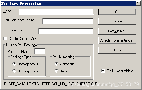 新建了一个原理图封装,右键选择New Part。自行输入元件名字。Parts Per Pkg是可以将元件划分多个部分进行绘制,这对于数百个引脚的IC使用多个Parts会很便于原理图绘制。