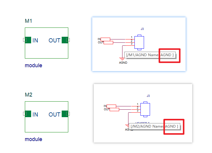 比如,复用了两个 模拟 模块M1和M2,需要独立的模拟地,但是按照下图的设计,AGND符号没有添加port,两个模块的AGND实际上还是连在一起,因为都是全局的电源符号,并且网络名都是AGND。
