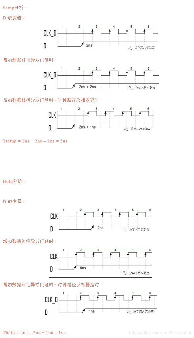 有利是指可以放宽要求,也就是往接近clk上升沿走。对于setup而言,最差情况是margin=0的点,也就是数据到达D端的时候刚好满足setup条件,此时本级skew可以预留出1ns的margin,所以setup可以放宽1ns(+)。相反,comb延迟使得数据往后推迟2ns,setup需要变紧(-)。