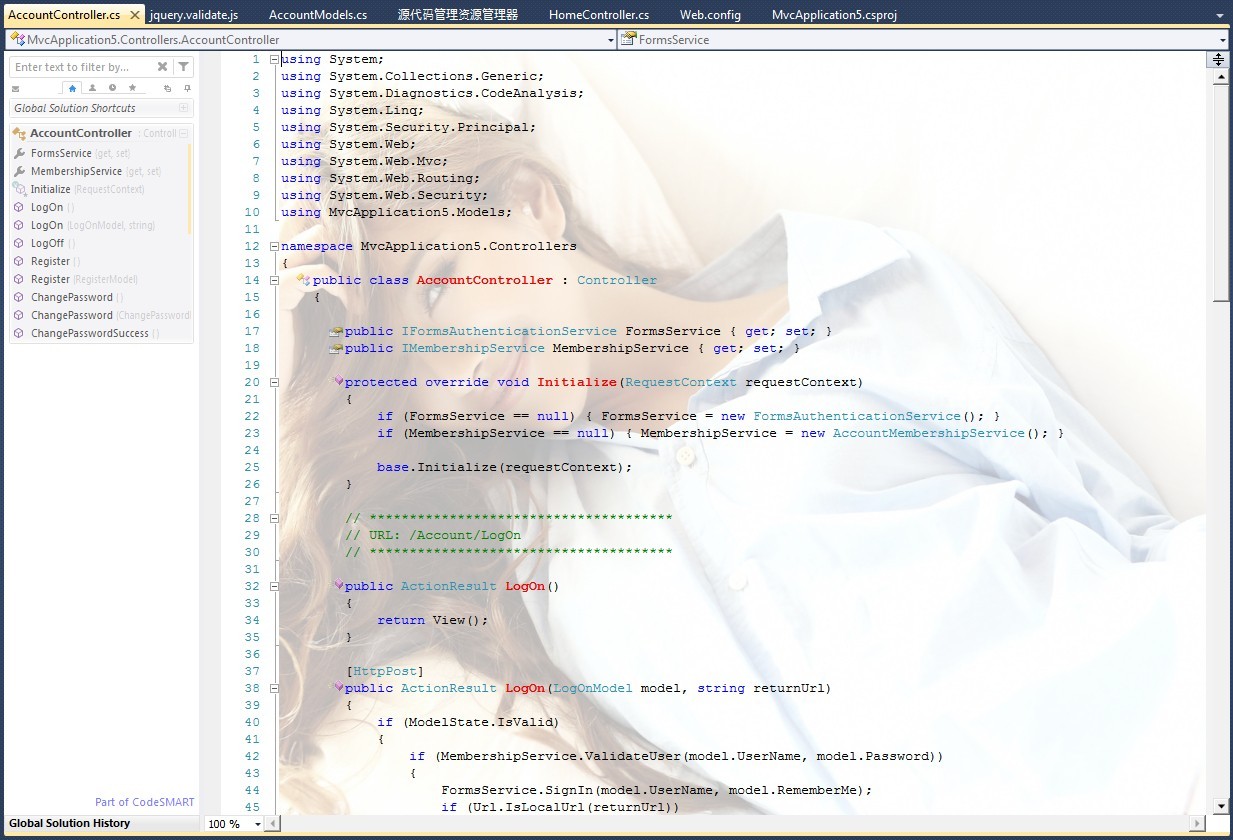 using System;using System.Collections.Generic;using System.Linq;using System.Text;using System.IO;using System.Threading;using System.Xml.Serialization; namespace VSEditorBackgroud{ internal static class ConfigConsts { public static readonly string ConfigPath = Path.Combine(Environment.GetFolderPath(Environment.SpecialFolder.Personal) + "\\Visual Studio 2010\\Settings", "VSEditorBackgroud.config"); private static Encoding nobomutf8; public static Encoding NoBomUTF8 { get { if (nobomutf8 == null) { Interlocked.CompareExchange<Encoding>(ref nobomutf8, new UTF8Encoding(false), null); } return nobomutf8; } } public static XmlSerializerNamespaces VoidNamespaceMapping { get { XmlSerializerNamespaces namespaces = new XmlSerializerNamespaces(); namespaces.Add("", ""); return namespaces; } } } }编辑器背景类 EditorBackgroud: