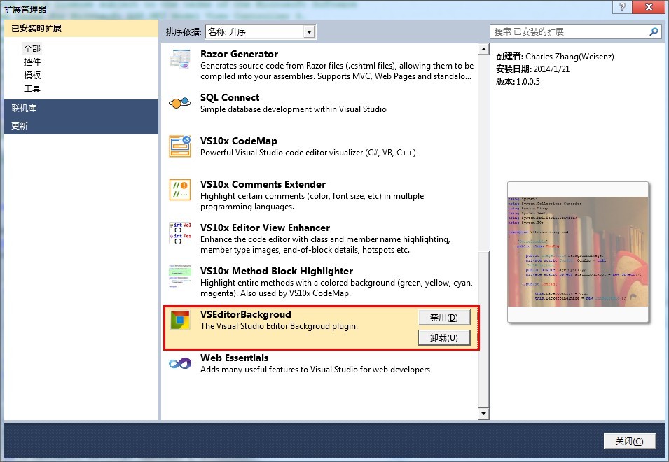 <?xml version="1.0" encoding="utf-8"?><Vsix xmlns:xsi="http://www.w3.org/2001/XMLSchema-instance" xmlns:xsd="http://www.w3.org/2001/XMLSchema" Version="1.0.0" xmlns="http://schemas.microsoft.com/developer/vsx-schema/2010"> <Identifier Id="3f2ce087-8d13-492c-a207-e1fdbfd1cf58"> <Name>VSEditorBackgroud</Name> <Author>Charles Zhang</Author> <Version>1.0.0.5</Version> <Description xml:space="preserve">The Visual Studio Editor Backgroud plugin. </Description> <Locale>4</Locale> <License>license.rtf</License> <Icon>icon.ico</Icon> <PreviewImage>PreviewImage.jpg</PreviewImage> <SupportedProducts> <VisualStudio Version="10.0"> <Edition>Ultimate</Edition> <Edition>Premium</Edition> <Edition>Pro</Edition> <Edition>Express_All</Edition> </VisualStudio> <VisualStudio Version="11.0"> <Edition>Ultimate</Edition> <Edition>Premium</Edition> <Edition>Pro</Edition> <Edition>Express_All</Edition> </VisualStudio> </SupportedProducts> <SupportedFrameworkRuntimeEdition MinVersion="4.0" MaxVersion="4.5" /> </Identifier> <References /> <Content> <MefComponent>|%CurrentProject%|</MefComponent> </Content></Vsix>在项目中添加一个 PreviewImage.jpg 用做插件的预览图,添加 icon.ico 用做扩展的图标。