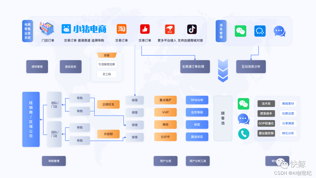 核心功能模块:线索接入、多场景获客、渠道ROI分析客户管理、素材库管理、交易管理。