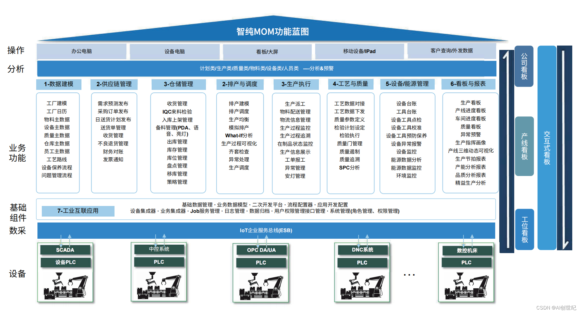 定义:美国仪器、系统和自动化协会(Instrumentation, System.and Automation Society. ISA)于2000年开始发布ISA-SP95标准,首次确立了制造运行管理(Manufacturing Operations Management MOM)的概念,针对更广义的制造运营管理划定边界,作为该领域的通用研究对象和内容,并构建通用活动模型应用于生产、维护、质量和库存4 类 主要运行区域,详细定义了各类运行系统的功能及各功能模块之间的相互关系。