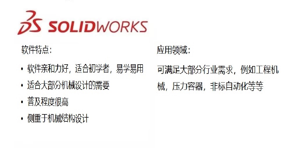 应用领域:功能比较全,可以满足大部分的行业需求。对于偏向结构设计的都会首选Solidworks软件,例如工程机械,压力容器,非标自动化行业等等。