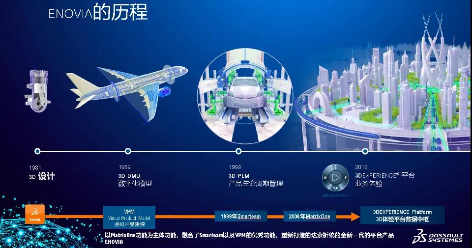 ENOVIA有着长久的历史,与达索系统3DEXPERIENCE发展紧密相关,ENOVIA初始名为VPM,达索系统分别于1999年、2006年分别收购了Smarteam和MatrixOne,后续ENOVIA以MatrixOne功能为主体功能,融合Smartean和VPM优秀功能,重新打造了达索系统的全新一代协同平台——ENOVIA。