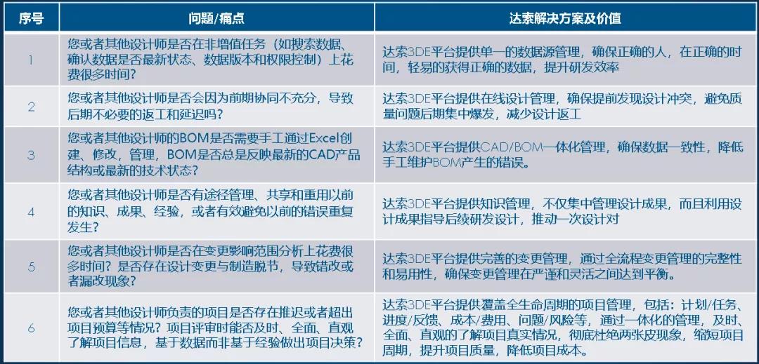 ENOVIA主要分两大主题,九大学科,3DEXPERIENCE平台是ENOVIA的技术底座,赋能ENOVIA九大学科的所有应用。3DEXPERIENCE ENOVIA解决方案价值在于帮助客户解决面对的痛点,帮助用户成功实现数字化转型。下图为客户常面对的问题及达索系统的方案说明: