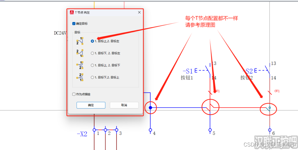 ④ T型节点方向需正确配置,具体可参考原理图中使用方法,概括起来就是需以端子为主。