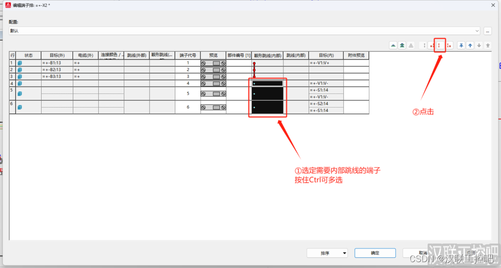 ① 端子方向正确配置,1连接内部接入的线,2连接外部接入的线,并选择正确的端子。