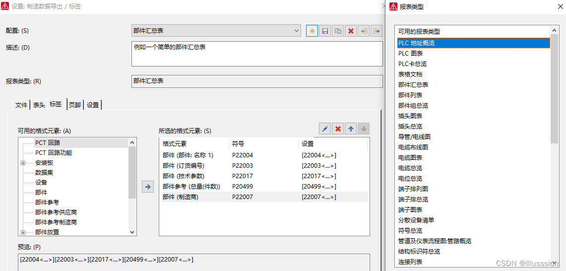 6 标签是EXCEL各列的标题,用 ### 表示要导出各列的内容,此处添加的标签顺序和数量要跟模板中列标题相一致,因为此处是汇总表,要汇总各部件的总量,所以模板中的数量对应的是“部件参考(总量(件数))”而不是“部件(数量/包装)”
