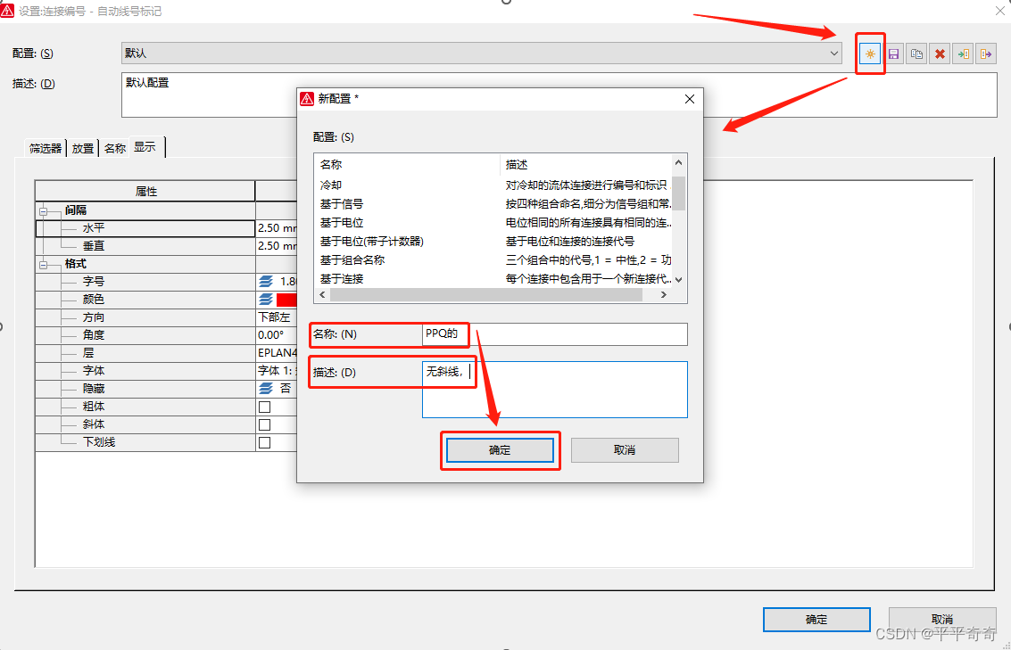 3.点击下图中右上方小太阳形状的新建图标,在弹出的新 配置 界面中输入名称(PPQ的)和描述后,点击下方的确认按钮。