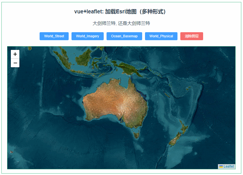 本示例演示如何在vue+leaflet中添加Esri地图,有多种形式,这里只列出四种World_Street、World_Imagery、Ocean_Basemap、World_Physical形式。