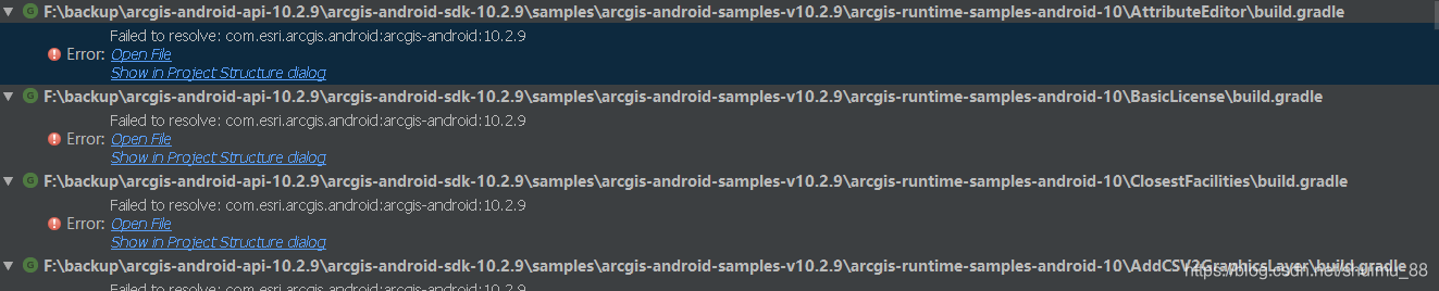 因移动自有品牌 手机 A6无法运行arcgis android 100.1/100.2/100.3,100.3以上版本没有亲测。所以下载arcgis-android:10.2.9版本sdk进行试用,发现自带的samples在gradle失败,报错Failed to resolve:com.esri.arcgis.android:arcgis-android:10.2.9