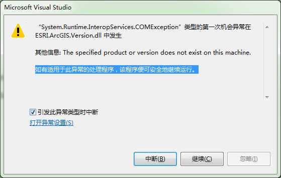 “System.Runtime.InteropServices.COMException”类型的第一次机会异常在 ESRI.ArcGIS.Version.dll 中发生