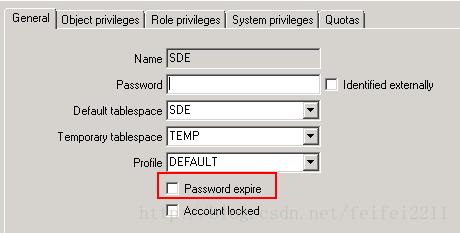 3. 编辑SDE用户,去掉 password expire选项前的√(在General选项卡中)。如下图所示。