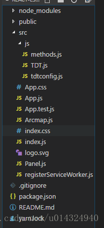 import React, { Component } from 'react';import ReactDOM from 'react-dom'import logo from './logo.svg';import './App.css';import Arcmap from './Arcmap'import Panel from './Panel' class App extends Component { constructor() { super(); this.state = { map: {} } } setMap(map){ this.setState({map});//初始化完成之后在添加经纬度显示面板 ReactDOM.render( <Panel map={this.state.map}/>, document.getElementById('xypanel')); } render() { return ( <div className="App"> <header className="App-header"> <img src={logo} className="App-logo" alt="logo" /> <h1 className="App-title">Welcome to React</h1> </header> <p className="App-intro"> To get started, edit <code>src/App.js</code> and save to reload. </p> <Arcmap setMap={this.setMap.bind(this)}/> <div id="xypanel"> </div> </div> ); }} export default App;项目结构: