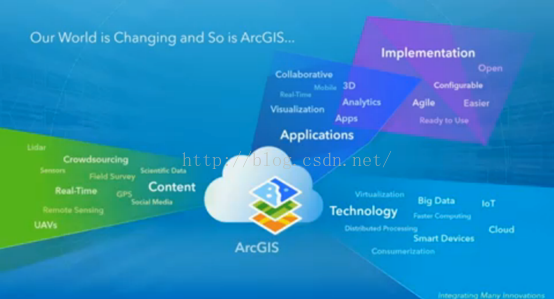专注执着不代表固步自封,ArcGIS平台一直紧随IT不断改变。云、大数据、实时、物联网、无人机等是当下最热的技术,ArcGIS在这些方面都有所增强。这些增强体现在ArcGIS提供的各项能力中:数据管理、制图及可视化、三维、空间分析、实时、影像、大数据。