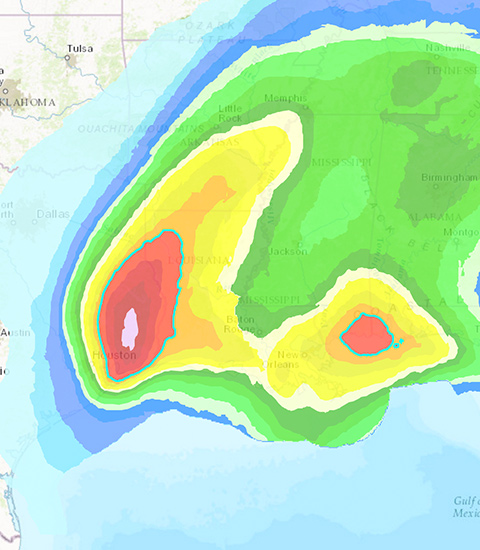GIS提供实时的态势感知。这张飓风图显示了风暴的轨迹,风暴潮以及对于人员和各业务的潜在影响。