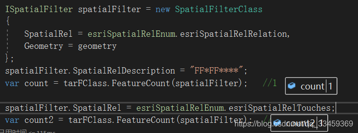 ISpatialFilter spatialFilter = new SpatialFilterClass(){ Geometry = geometry, GeometryField = originFClass.ShapeFieldName, SpatialRel = esriSpatialRelEnum.esriSpatialRelRelation};spatialFilter.SpatialRelDescription = "FF*FF****"; //"F*T***T**";但是在实际运用中却出现了问题,忘大神们看到能给点提示。