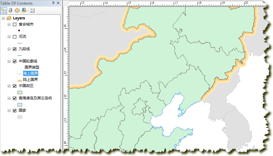 这一步我们从中国政区的线文件(bou2_4l)中提取出九段线。名称是叫九段线,但是实际上在现在地图出版物中都是10段的。这一步比较简单,在编辑状态下选出这10段线,导出成单独的文件,命名为“九段线.shp”。