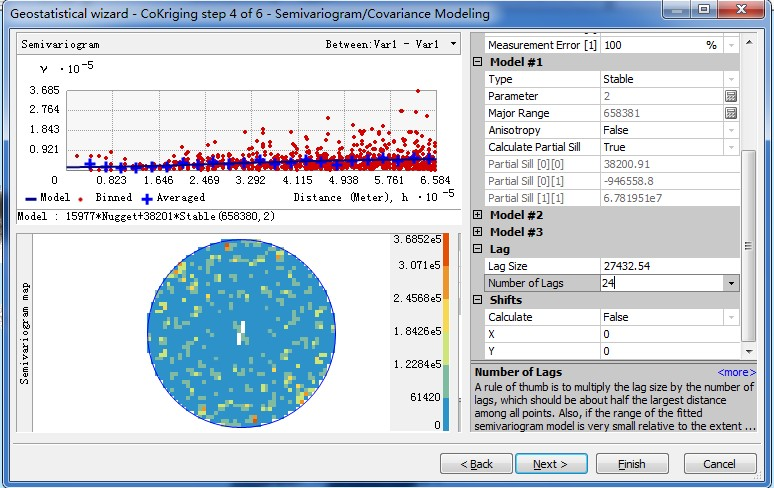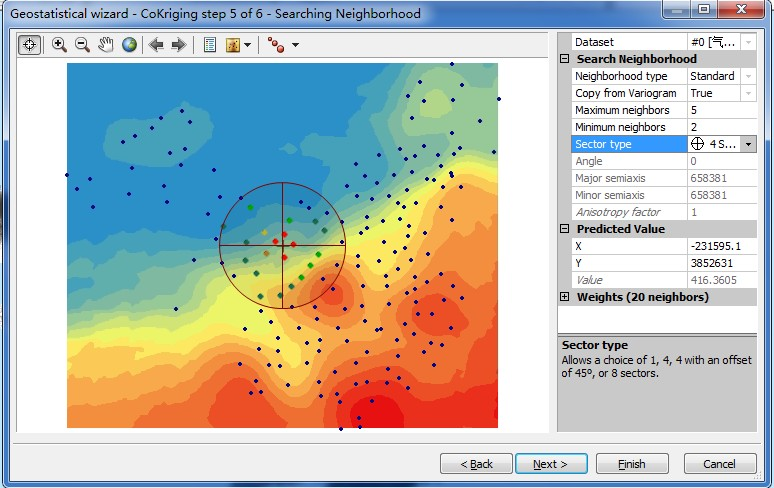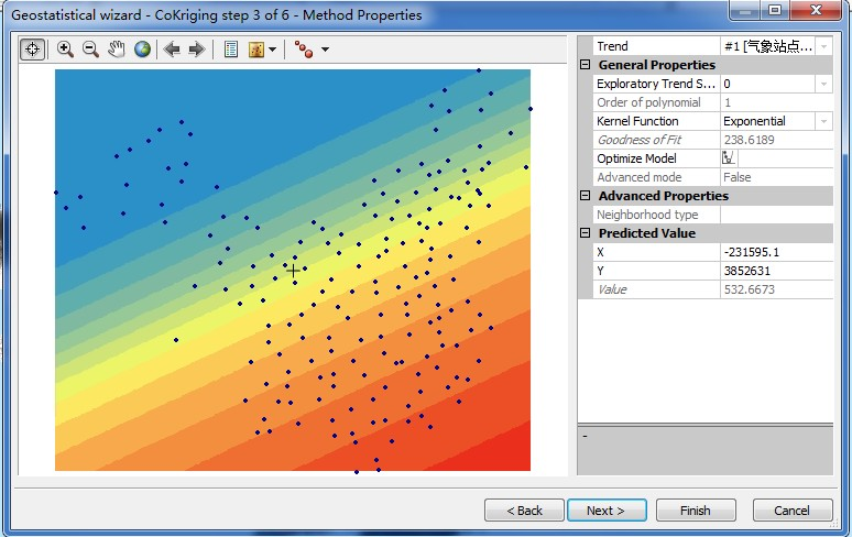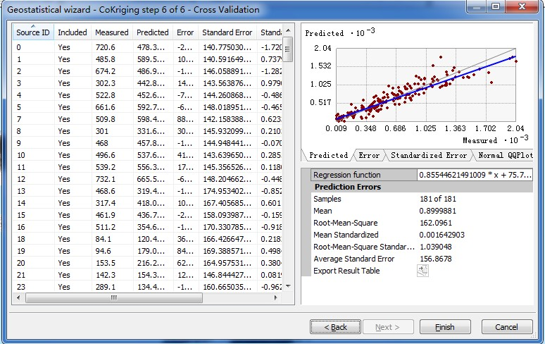 由交叉验证结果可以看出,插值误差为0.899(毫米),均方根误差162.0961,平均标准误差为156.8678,两者比较接近。标准均方根误差为1.039048。点击Finish完成插值。