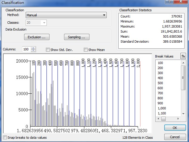 注意,这一步我们从克里金插值得到的结果做起,而不是从导出的栅格数据做起,因为ArcGIS将插值结果导出栅格时会有一些小小的问题(从图2-16的西藏地区的结果可以看出,当然这也可能是样本点的问题)。从插值结果可以看出,年降水量在1.68-1957.28mm的范围内,我们按照母100毫米分一级的等距分级法进行分级。双击插值结果图层打开Layer Properties对话框,在Symbology选项卡中选择Classified方法,点击“Classfify…”,选择“Manual”,Classes:20,在“Break”中手动输入从100-2000: