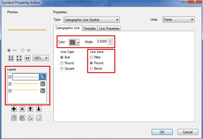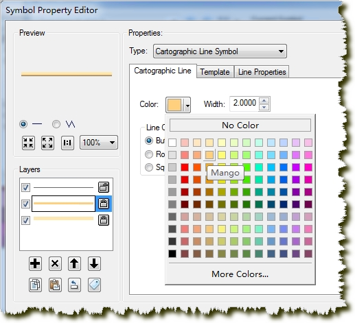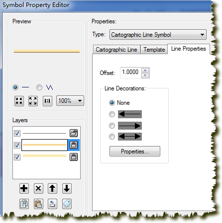 对对话框中点击左下的“+”号新建两层。将线型符号的颜色设为50%灰度,线宽0.5,Line Joins为“Round”。第二层的颜色设为Mango(RGB 255,211,127),线宽2,Line Joins设为“Round”,将Line Propeties中的Offset设为1。类似地,第三层的颜色设为Topaz Sand(RGB 255,235,175),线宽4,Line Joins设为“Round”,将Line Propeties中的Offset设为2。点击确定,返回Symbol Selector对话框,可以将刚刚设置的样式保存。
