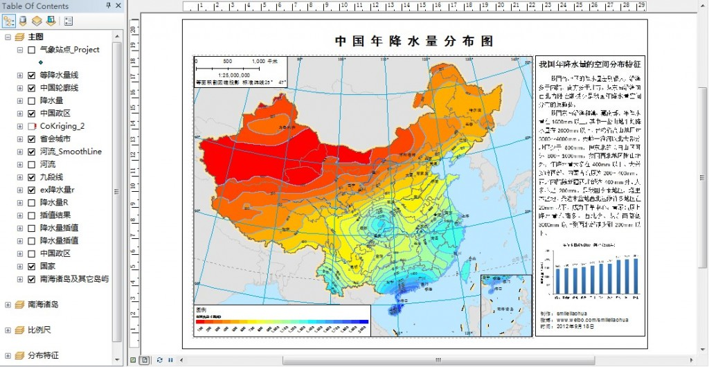 总结:制作一幅精美的地图要考虑很多的因素,一些很小的细节都要考虑到,涉及到从数据到处理到分析的各个方面。ArcGIS为精细化制图提供了一个很好的平台。当然本文的最终结果还有很多可以改进的地方,比如有的地方样本点太少(如西藏,台湾),导致这些地方的插值结果误差较大(涉及到数据的问题);本文使用的协同克里金插值是否是正确的需要进一步考证(涉及到降水的插值方法);地图的配色是否美观等等。