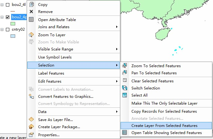 在bou2_4p图层上右击选择Selection->Create Layer From Selected Features。将选中的要素创建一个新的图层。