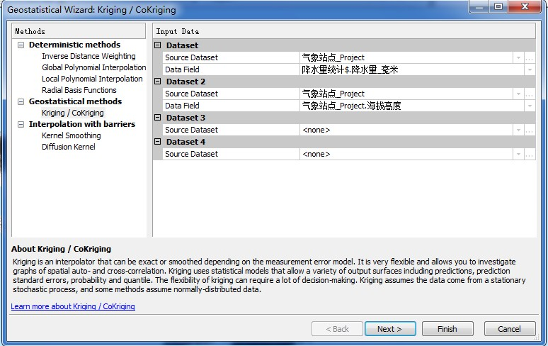 第一步:在“Methods”中选择“Kriging/CoKriging”,Dataset中选择“气象站点_Project”,DataField选择“降水量_毫米”,Dataset 2中选择“气象站点_Project”,DataField选择“海拔高度”;