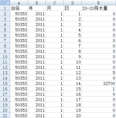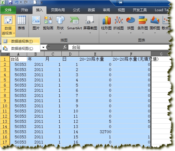 在下到的数据中,有一些值如999、9999、32700等是填充值,要先去掉。接下来,这些数据存放的是每个台站365天的降水量,所以先要统计得到每个站的年降水量数据。在Excel中打开降水量数据表,选中所有数据,点击插入->数据透视表,插入一个新的数据透视表。