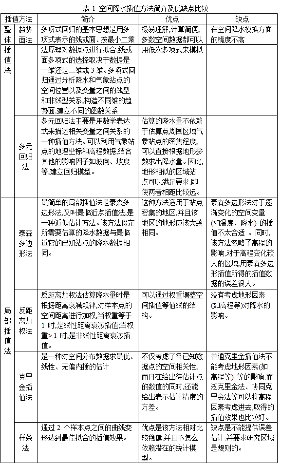 接下来我们便要用这181个样本点的数据插值得到全国的年降水量分布。空间降水插值一直是个难题,影响降水的因素很多,如经度、纬度、高程、坡度、坡向、离水体的距离等,建立一个通用的降水插值模型几乎是不可能的。空间降水插值方法很多,优缺点和适用性不同。总体上,降水的空间插值方法有3类:整体插值法(趋势面法和多元回归法等) 、局部插值法(泰森多边形法、反距离加权法、克里金插值法和样条法)和混合插值法(整体插值法和局部插值法的综合) 。何红艳(2005)比较了各种降水插值的优缺点: