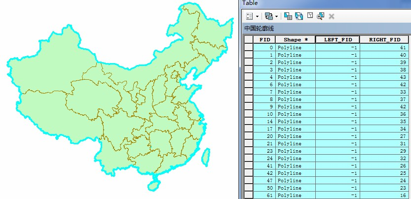 打开“中国线.shp”属性表,选中LEFT_FID=-1或者RIGHT_FID=-1的所有要素,这个时候边界上的所有线要素就被选中了。如前所述的方法,将选中的要素创建图层,并导出成单独的图层,命名为“中国轮廓线.shp”。