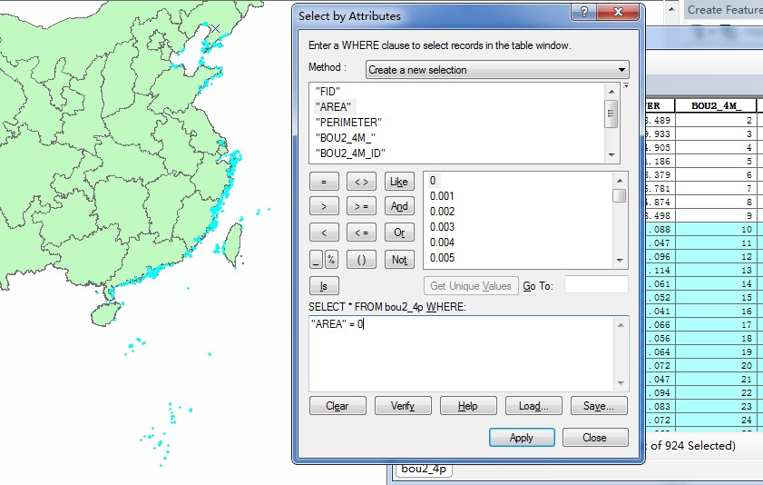 接下来我们就可以删掉面积小的岛屿了。继续进入编辑状态,打开bou2_4p的属性表,打开Select by Attribute对话框,输入"AREA"< 0.01,点击apply,选中面积为小于0.01的多边形,删除。
