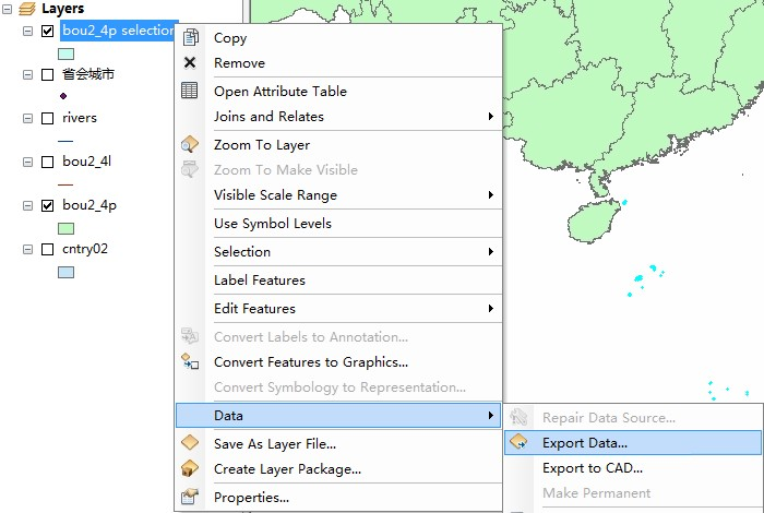 停止编辑,在刚刚产生的图层上右击选择Data->Export Data…,将选择的要素导出,命名为“南海诸岛及其它岛屿.shp”。