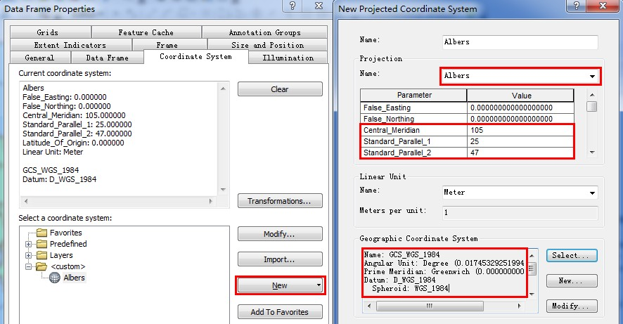 打开ArcMap将这些文件添加进去,接下来我们要给Dataframe设置一个投影坐标系。由于我们要做的是中国全国的降水量分布,我们使用等面积的Albers投影。右击Layers->Properties->Coordinate System选项卡->newProject System,选择Albers,设置中央经线105,标准纬线25度,47度,在地理坐标系中选择WGS84。设置如图: