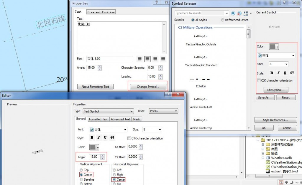 点击确定。点击菜单”Insert”->”Text”插入“北回归线”四个字,双击这四个字,如下设置: