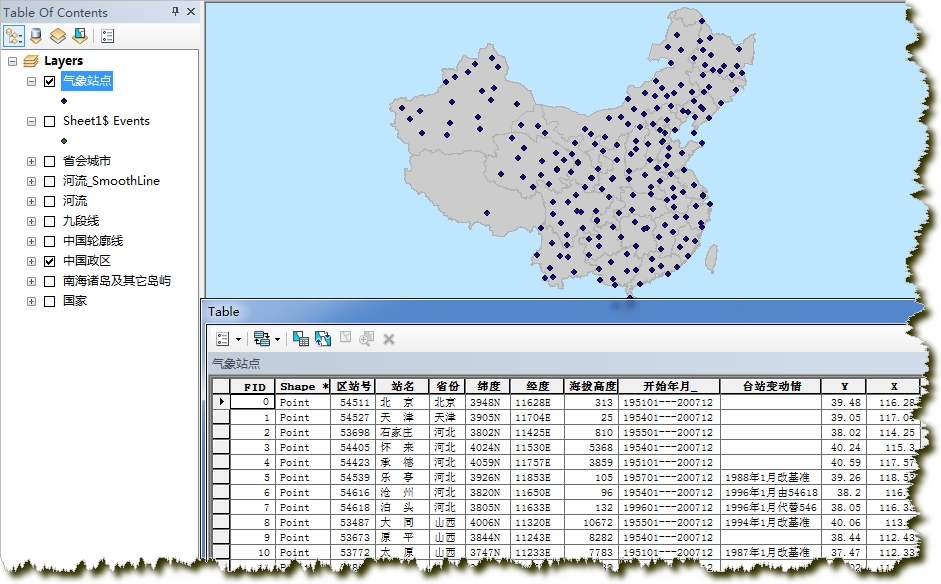 在下载到的站点信息中提供了每个站点的经纬度坐标,这样我们可以利用ArcMap->File->Add Data->Add XY Data将站点导入ArcMap中,注意导入时设置坐标系为WGS84。用Data->ExportData将站点导出成shp文件,命名为“气象站点.shp”。如图2-4。