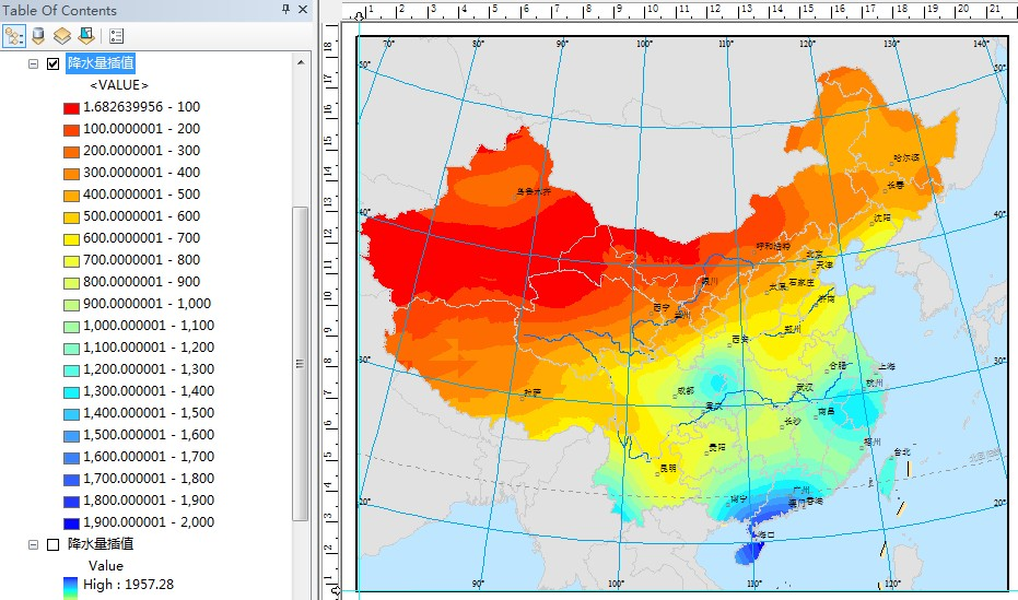 在插值结果图层上右击,选择Data->Export to Raster,将结果导出成栅格数据。并使用Spatial Analyst->Extraction->Extract byMask将中国区域提取出来,结果如图: