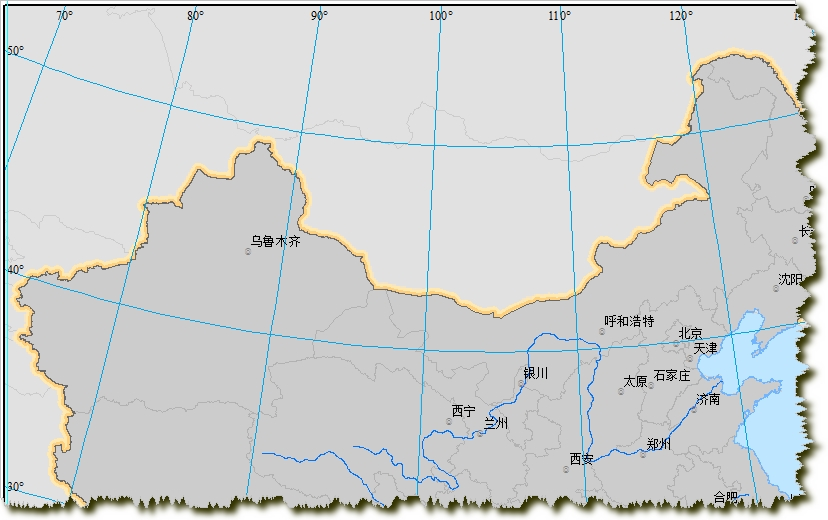 使用ArcToolbox->Cartography Tools->Generalization->Smooth Line工具,将河流光滑。”SmoothingAlgorithm”方法选择BEZIER_INTERPOLATION。完成以后设置河流的符号样式为:颜色Cretean Blue(RGB 0,112,255),线宽0.5。为了只让它显示长江和黄河,双击光滑过的河流图层,切换到“Definition Query”选项卡,在Definition Query中输入"NAME" = 'Huang He' OR "NAME" = 'Yangtze',点击确定。