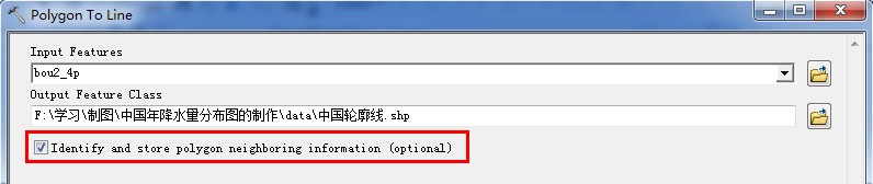 打开Toolbox->Data Management Tools->Features->Polygon to Line,将输出文件命名为“中国线.shp”。确保”Identifyand store polygon neighboring information(optional)”选中(保留每条线段两边的多边形信息是下一步提取轮廓线的关键;另外,Feature to Line也能实现面转线的功能,但是没有选项)。