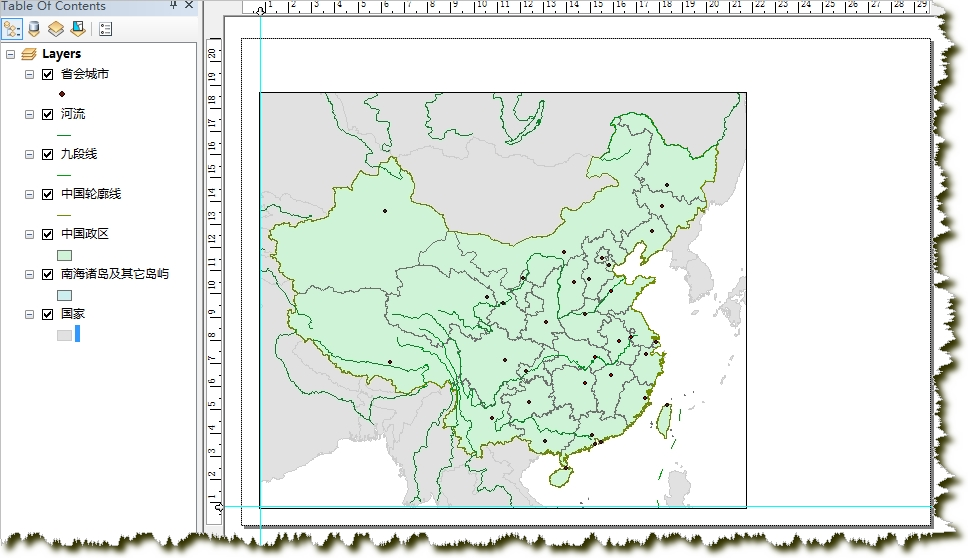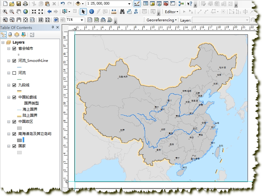 首先在File->Page and Print Setup中,将纸张调成横向。进入版面视图,适当调整数据框的大小和位置(上面留出写标题的空间,右边留出说明文字的空间),将地图比例尺改为1:25 000 000。