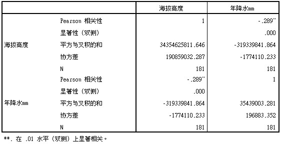 在我们关联的降水量数据以后,气象站点的属性表里就有了站点的高程和站点的年降水量。把属性表导出,并用SPSS检验两者的相关性,结果如下: