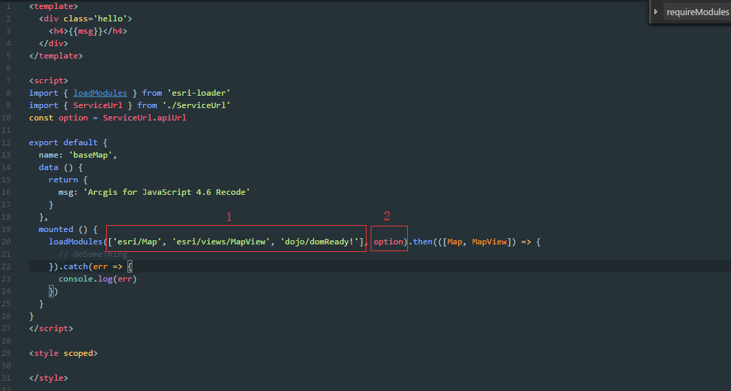 npm install --save esri-loader 或者 yarn add esri-loader@import url('https://js.arcgis.com/3.24/esri/css/esri.css');JS的方法,但是介绍了一种懒加载JS的方法,当然这个也可用于选择API的版本,也可以改变URL为本地离线部署的地址,例如:const options = { url: 'https://js.arcgis.com/3.24/' // 这里的API地址可以是官网提供的CDN,也可在此配置离线部署的地址}esriLoader.loadModules(['esri/map'], options) // 传入需要使用的类.then(([Map]) => { // doSomeThing}).catch(err => { console.error(err)}) esri-loader已经下载好,现在需要对项目进行少许的配置