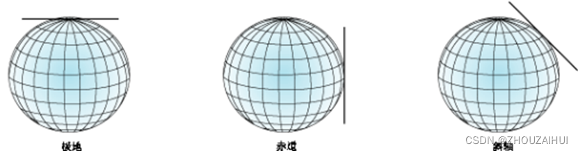 (3)横轴投影:极点在赤道上,或投影面的中心线与地轴垂直。