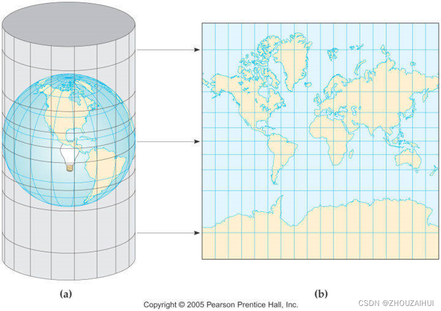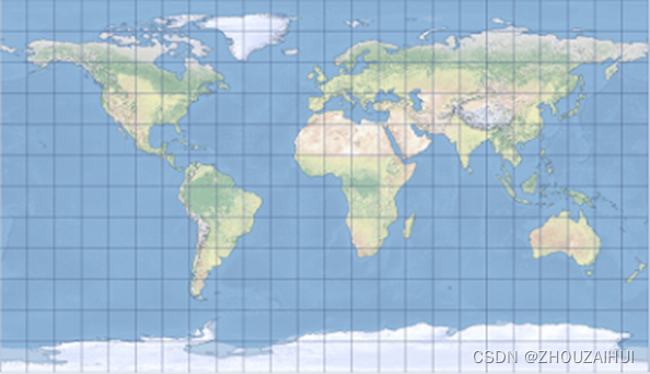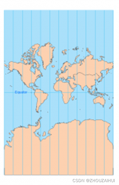等积投影保持所显示要素的面积不变。形状、角和比例等其他属性都将发生变形。在等积投影中,经线和纬线可能不垂直相交。