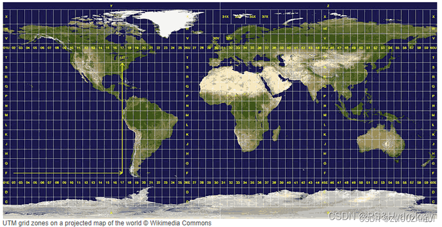 UTM 经度区范围为1到60,其中58个区的东西跨度为 6°。经度区涵盖了地球中纬度范围从80°S到84°N之间的所有区域。一共有20个UTM纬度区,每个区的南北跨度为8°;使用字母C到X标识(其中没有字母 I 和 O)。A、B、Y、Z 区不在系统范围以内,它们覆盖了南极和北极区。