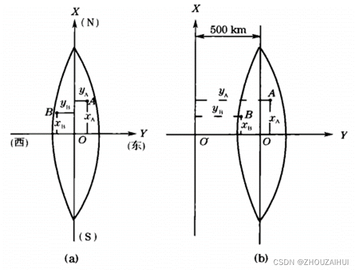 如上图(a)中所示,X坐标是指偏移离开赤道的距离,都为正值;Y坐标是指偏移离开中央子午线的距离,同时偏移方向可以在西侧,也可以在东侧,因此Y坐标可正可负。