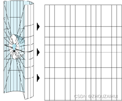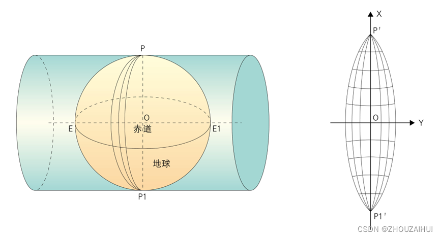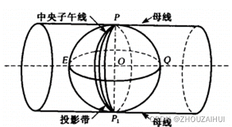 高斯投影时,设想取一个空心圆柱体与地球椭球体相切于某一投影带的中央子午线。在球面图形与圆柱面图形保持等角的条件下,将球面图形投影到圆柱面上,然后将圆柱体沿着南北极的母线切开并展开成平面。